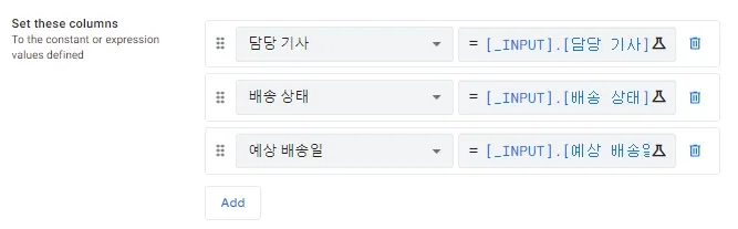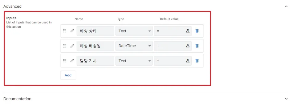 프롬프트를 사용하여 변경하고자 하는 셀은 ‘담당 기사’, ‘배송 상태’, ‘예상 배송일’로 3개 였지요? Inputs도 ‘Add’버튼을 사용하여 3개로 늘려주었습니다. 각각의 Inputs 변수를 수식에서 사용하기 위해서 Name을 다음과 같이 설정하였습니다. Inputs의 각 Type은 테이블 컬럼에 세팅된 Type과 일치하지 않는 경우 에러가 발생할 수 있기 때문에 Type을 일치시키는 것이 좋습니다.