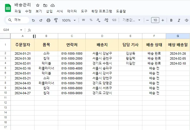 가구의 배송을 관리하는 구글 시트로, 이해를 돕기 위해 최소한의 데이터만 사용하였습니다.