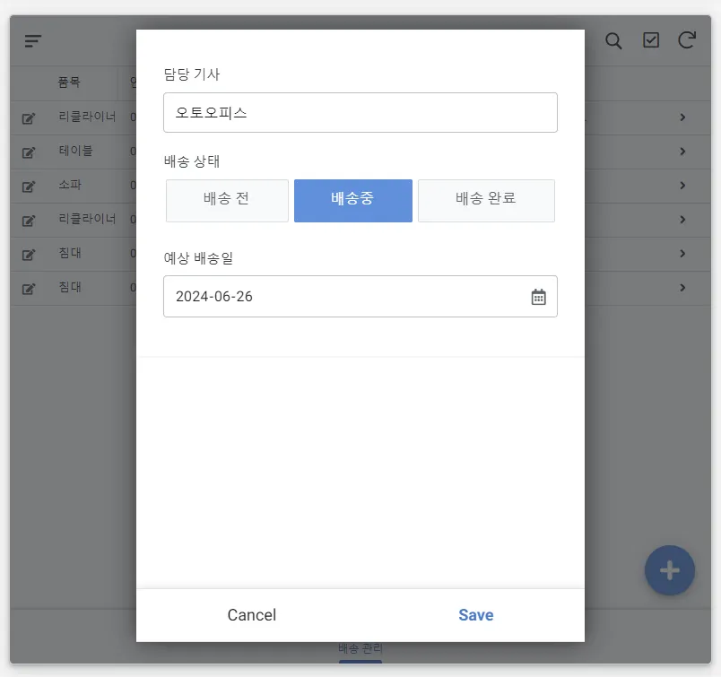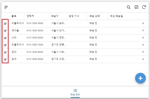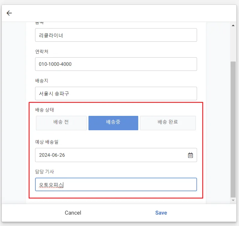 앱시트에서 담당 기사, 배송 상태, 예상 배송일을 지정하려면 어떻게 해야할까요? 다음과 같은 편집 화면에서 정보를 등록하는 방법도 있습니다. 하지만 수정이 필요하지 않은 값들도 화면에 노출이 되기 때문에 정보들이 많다면 번거롭게 스크롤을 하면서 수정할 부분을 찾아야 합니다.