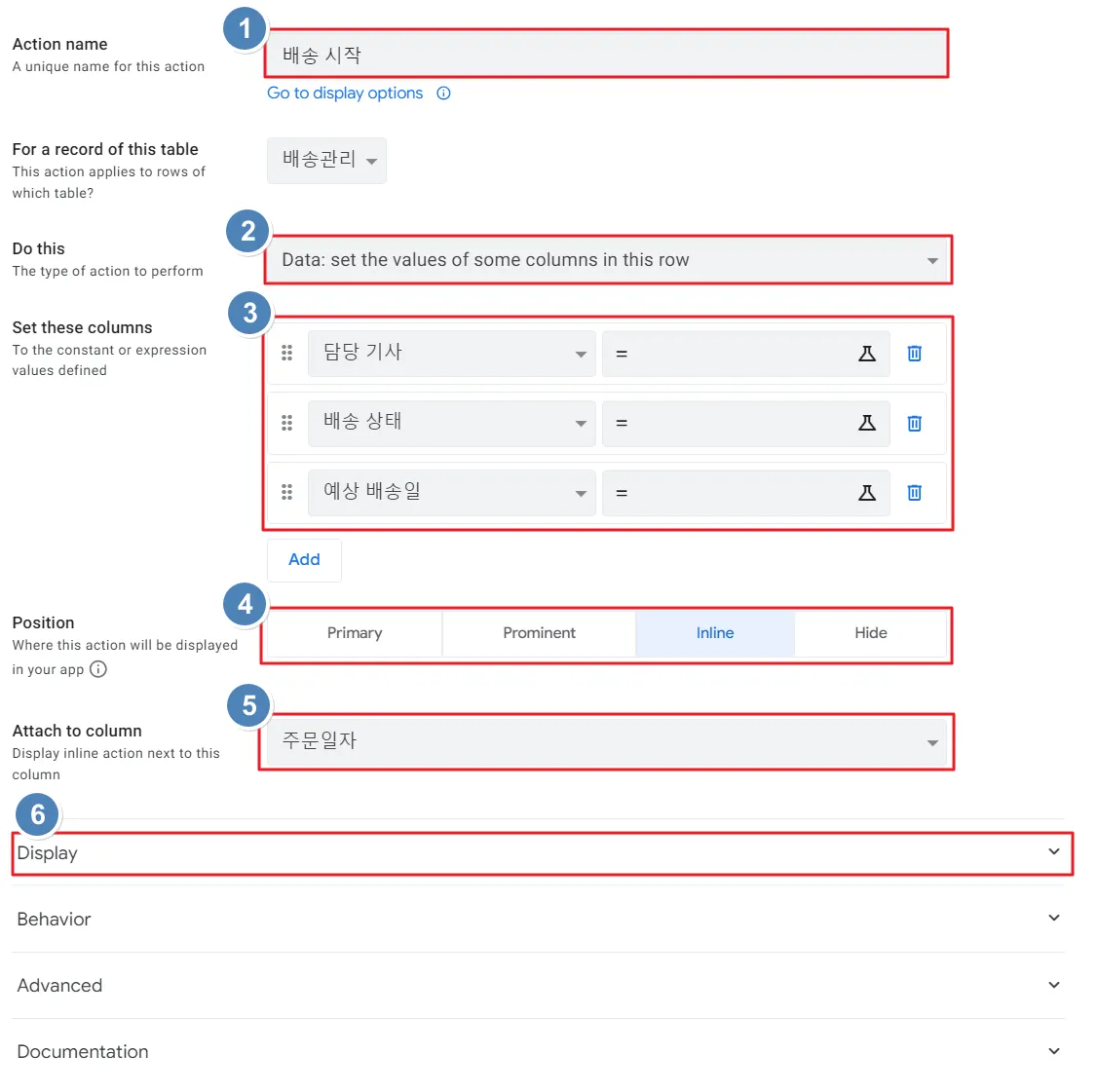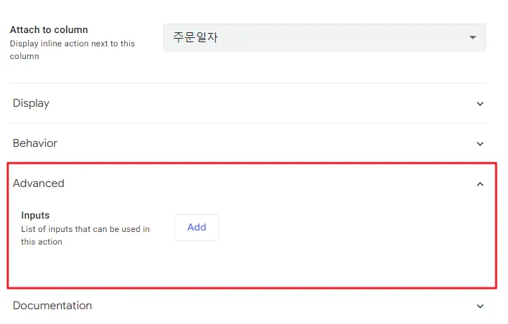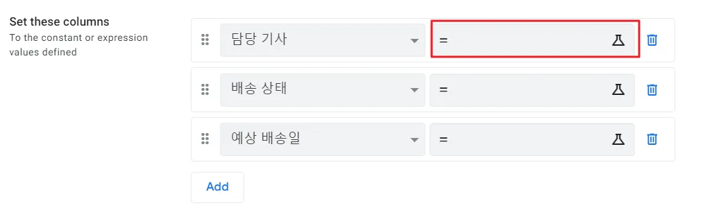 저장을 마쳤다면 이제 앱시트의 컬럼과 Inputs를 연결해보겠습니다. 액션 설정 화면에서 다음의 수식 입력창을 클릭합니다.
