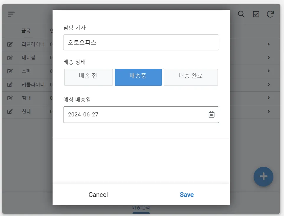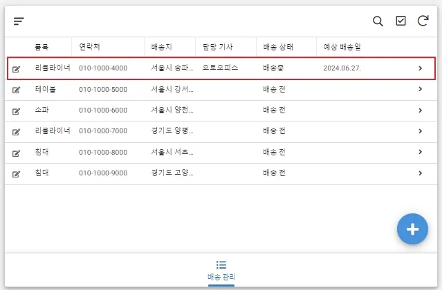 주문 배송을 관리하는 앱시트에서 특정 주문 건의 주문 상태를 ‘배송중’으로 수정하고 예상 배송 일자를 기입