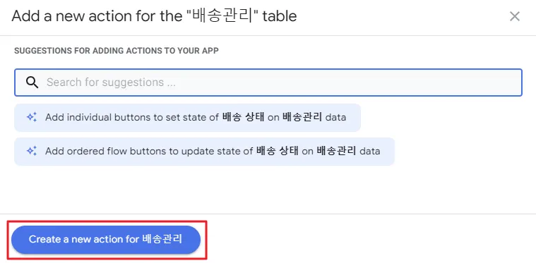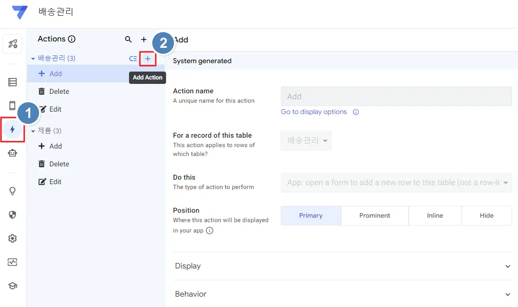 앱시트 에디터에서 좌측의 ‘Action’메뉴로 들어갑니다. Action 메뉴에서 기능을 추가할 테이블에서 사진과 같이 ‘Add Action’ 버튼을 클릭합니다. 예시에서는 배송관리 테이블에 기능을 추가하겠습니다.