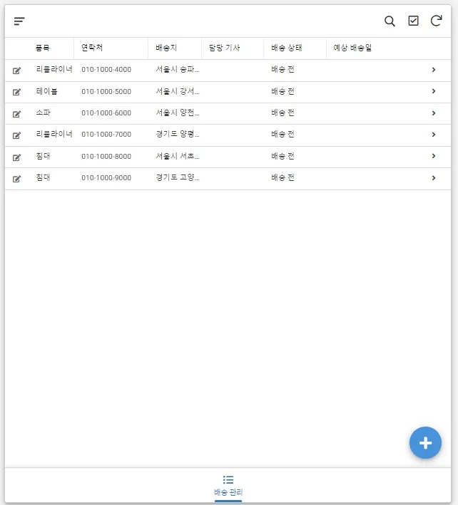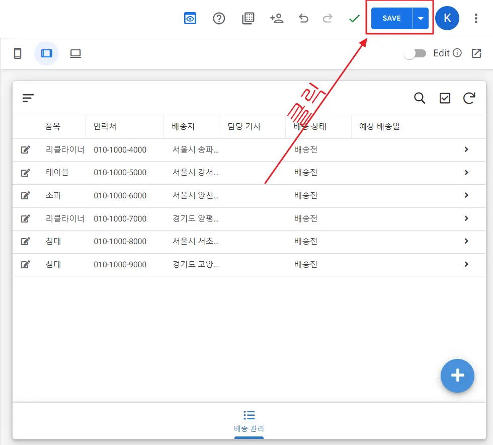 ‘배송관리’ 구글 시트에서 배송 상태가 ‘배송 전’인 주문 건들을 필터링하여 앱시트 뷰에 추가하였습니다.