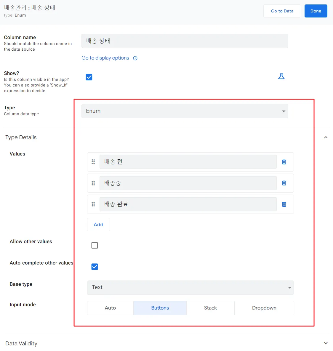 프롬프트 창에서 유의할 점은, 배송 상태가 버튼 형식으로 되어 있다는 것이지요. 그 이유는 배송 상태의 컬럼 세팅이 Enum, Input Mode가 버튼 형식으로 되어있기 때문입니다. Type을 다른 형식으로 변경하면 프롬프트에서도 반영되므로 필요에 따라 수정하여 사용할 수 있습니다.