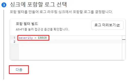 이 기능을 통해 로그 데이터의 유효성을 높이고 불필요한 부하를 줄일 수 있습니다. 아래 사진과 같이 ‘severity=ERROR’를 입력하면 로그의 심각도(severity)가 ERROR인 로그만을 선택하게 됩니다. 아래와 같이 입력 후 ‘다음’ 버튼을 눌러주세요