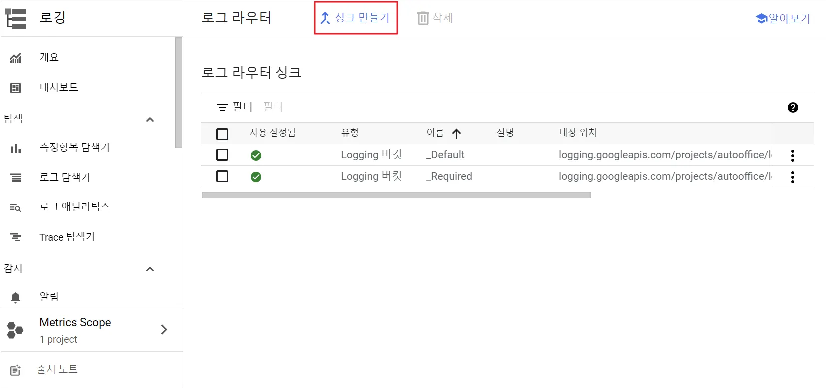 (4) 로그 라우터 기능 페이지로 들어왔습니다. 상단의 ‘싱크 만들기’ 를 클릭합니다. 로그 라우터의 싱크를 설정하는 것은 로그 라우터가 수집한 로그를 어디에 저장할지를 결정하는 과정입니다.