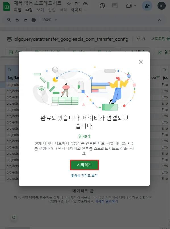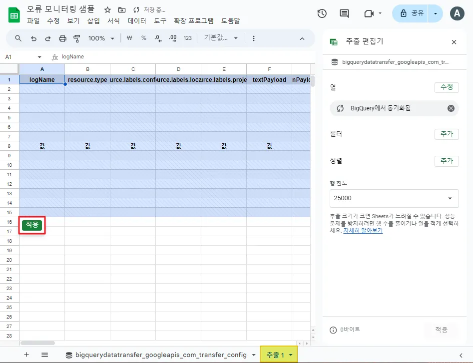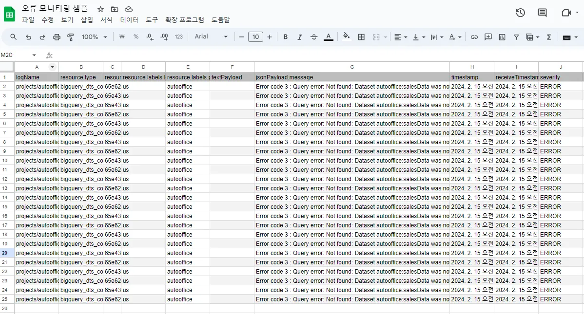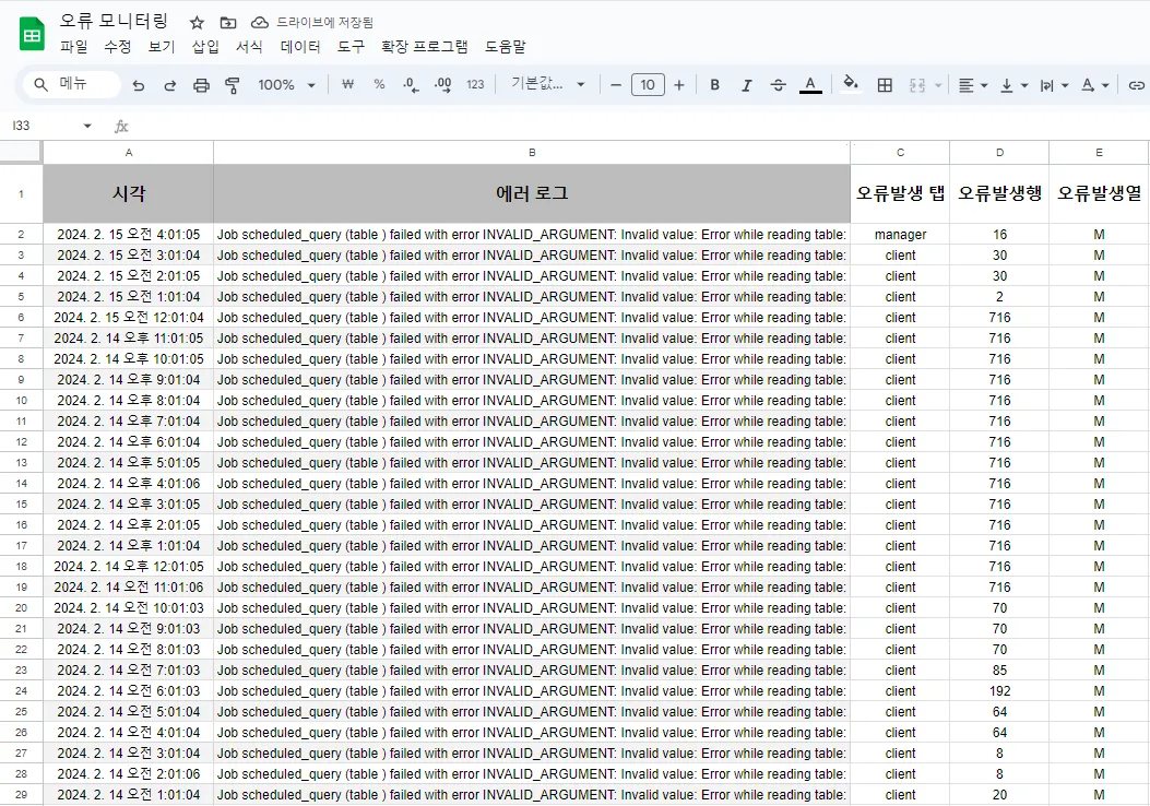 빅쿼리의 에러 내역을 스프레드시트에서 보여주는 화면