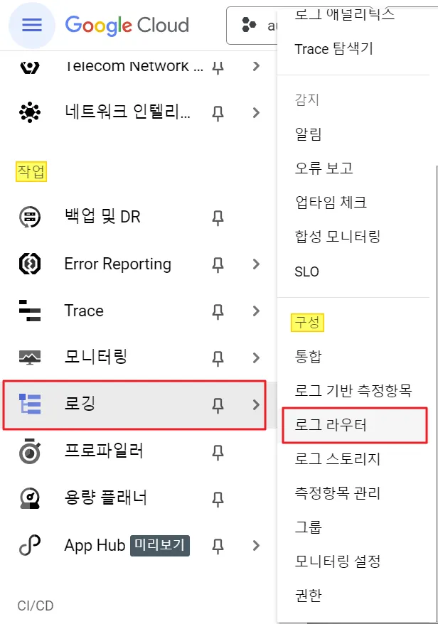 ‘작업’ 탭 하위에 ‘로깅’, ‘구성’ 탭 하위에 ‘로그 라우터’를 클릭합니다.