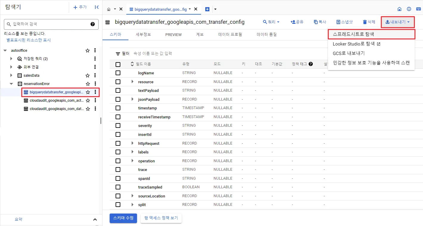 (1) 에러 테이블(bigquerydatatransfer_googleapis_com_transfer_config) 을 클릭하여 아래의 화면으로 전환합니다. 상단의 ‘내보내기’ 클릭 후 ‘스프레드시트로 탐색’을 클릭합니다.