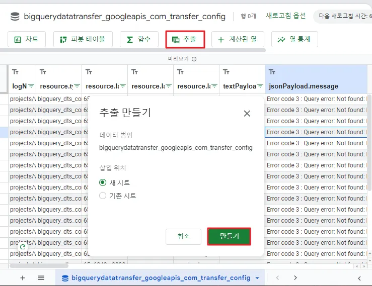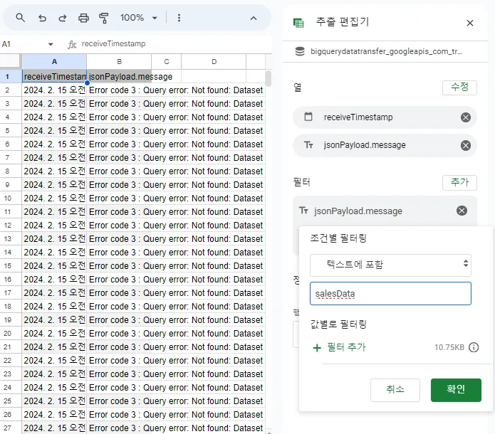 하지만, 예약된 쿼리가 다양하고 관리하는 데이터 세트가 여러 개인 경우 에러를 수집하는 단일 테이블에는 여러 테이블의 에러가 뒤섞이게 됩니다. 쿼리를 실행하면 간편하게 원하는 테이블의 에러만 확인할 수 있지요. 이와 비슷하게 스프레드시트에서도 추출 편집기를 통해 원하는 에러만 추출하여 가독성을 높일 수 있습니다.