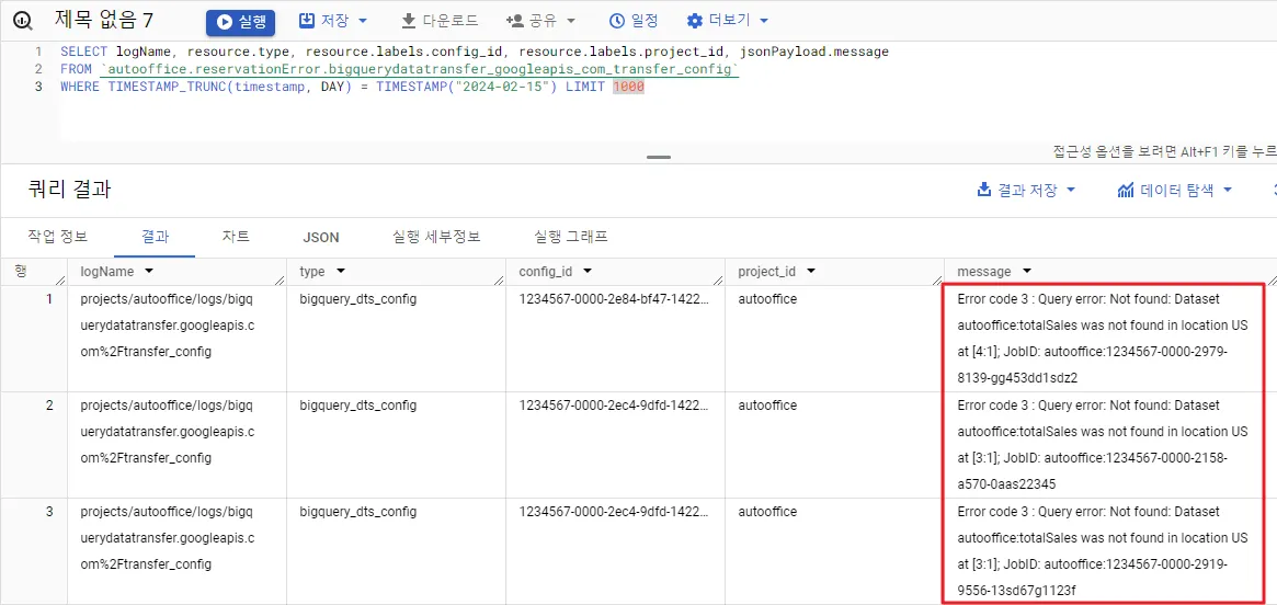 (3) 에러를 확인하였습니다. 로그 라우터가 정상적으로 실행되고 있다면 해당 에러는 빅쿼리 테이블에도 저장되어있어야 합니다. 데이터 세트 안에 자동으로 생성되었던 테이블(bigquerydatatransfer_googleapis_com_transfer_config)의 데이터를 불러오기 위해 빅쿼리의 쿼리 창에 다음과 같은 쿼리를 입력 후 실행해보겠습니다.