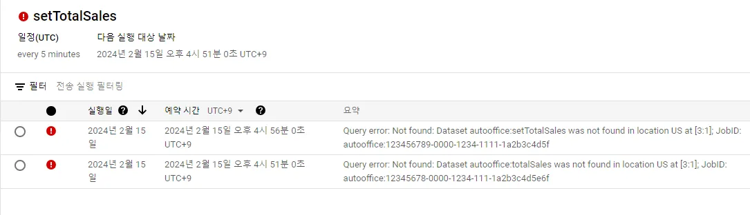 (2) 에러가 발생한 예약된 쿼리 이름을 클릭하면 아래와 같이 상세 내역을 볼 수 있습니다.