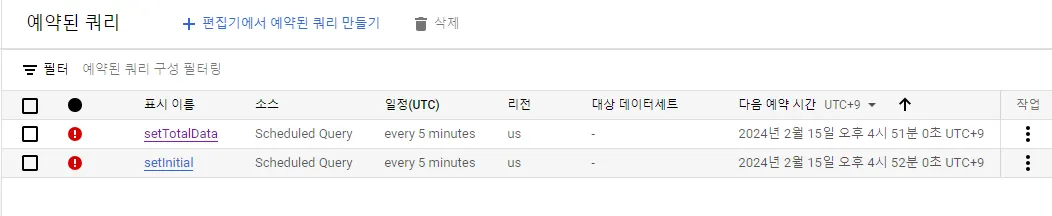(1) 에러를 테이블에 저장하기 위해서 쿼리를 예약하고, 의도적으로 에러를 발생시켜보겠습니다. ‘예약된 쿼리’ 메뉴에서 에러가 발생한 쿼리를 클릭해보겠습니다.