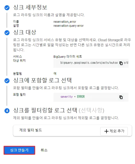 (7) ‘싱크에 포함할 로그 선택’ 창은 빅쿼리와 같은 클라우드 스토리지에 로그를 전송할 때, 어떤 종류의 로그를 저장할 것인지 결정할 수 있습니다.