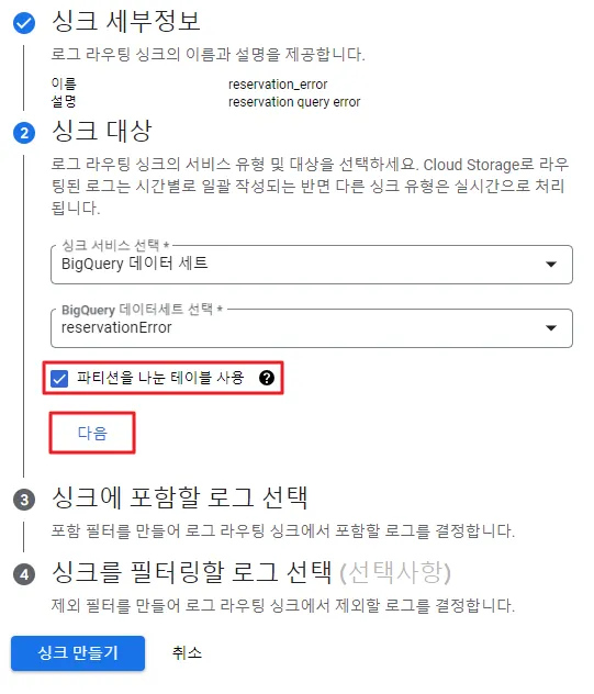 (6) 싱크 대상을 ‘BigQuery 데이터 세트’로 선택하고, 로그를 저장하기 위해 미리 만들어둔 데이터 세트를 선택합니다. ‘파티션을 나눈 테이블 사용’ 옵션을 사용 설정하면 날짜별로 내부 파티션을 나눈 테이블에 로그가 저장되어 쿼리 성능을 높일 수 있습니다. 설정 후 ‘다음’ 버튼을 클릭합니다.