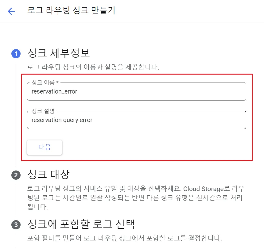 (5) ‘로그 라우팅 싱크 만들기’ 메뉴에서 싱크 세부정보를 입력하고 다음 버튼을 클릭합니다.