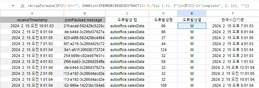 (6) 불필요한 셀들을 숨기거나 제거하고, 새로운 열을 추가 후 ‘ArrayFormula’ 함수와 정규표현식을 활용하면 아래와 같이 에러가 발생한 탭이나, 행 정보를 보기 좋게 정리할 수 있습니다.