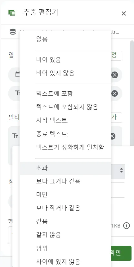 추출 편집기에서 필터링 조건 입력 후 ‘확인’ 버튼 클릭
