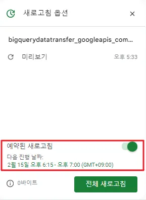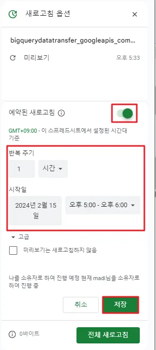 (4) 새로고침 옵션에서는 빅쿼리의 에러 테이블을 내보내는 주기를 설정할 수 있습니다. ‘예약된 새로고침’ 토글을 ON 하고, 원하는 반복 주기를 설정 후 ‘저장’을 클릭합니다.