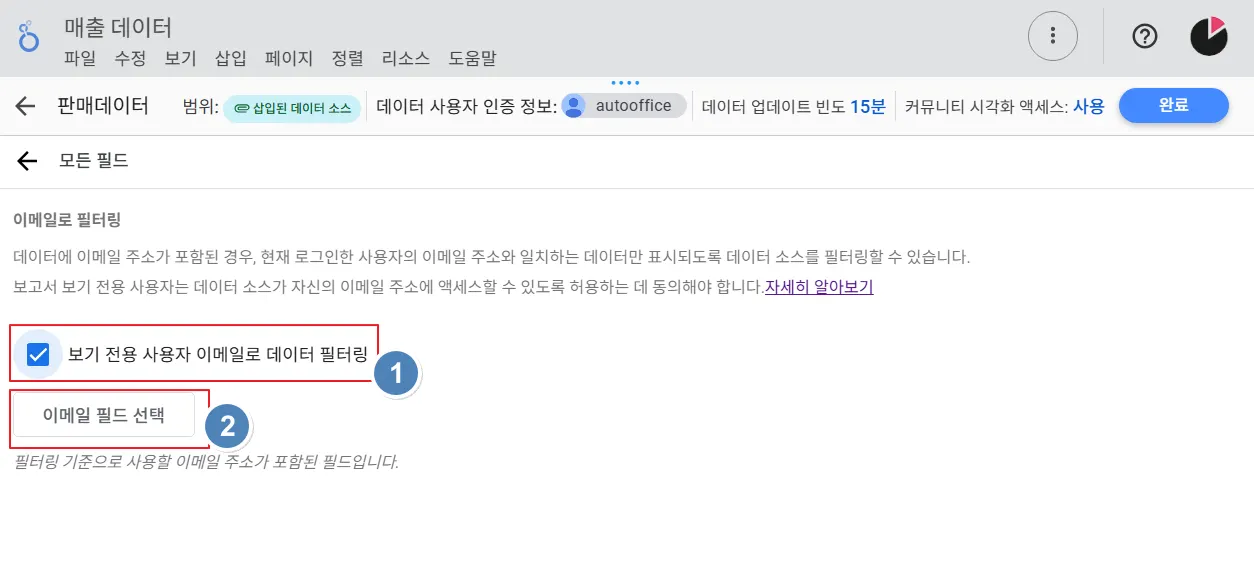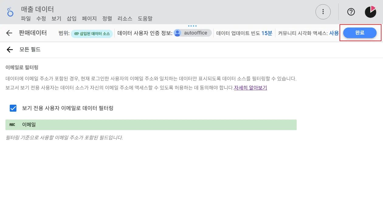 이렇게 설정하면 ‘이메일’ 컬럼과 대시보드에 접속한 사용자 계정을 대조하여 이메일이 일치하는 행만 대시보드에 보여주게 됩니다. 설정을 마쳤으니 우측 상단의 ‘완료’ 버튼을 클릭하겠습니다.