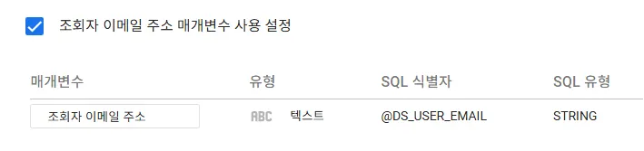 ‘조회자 이메일 주소 매개변수 사용 설정’을 체크하면 그 아래에 아래와 같은 변수 정보가 나옵니다. SQL식별자인 이제 @DS_USER_EMAIL 을 쿼리에 직접 삽입하여 사용할 수 있게 됩니다.