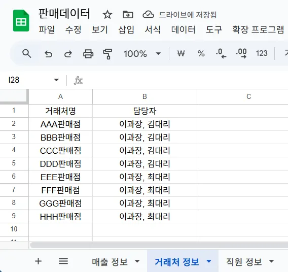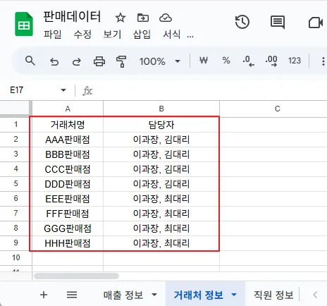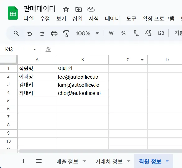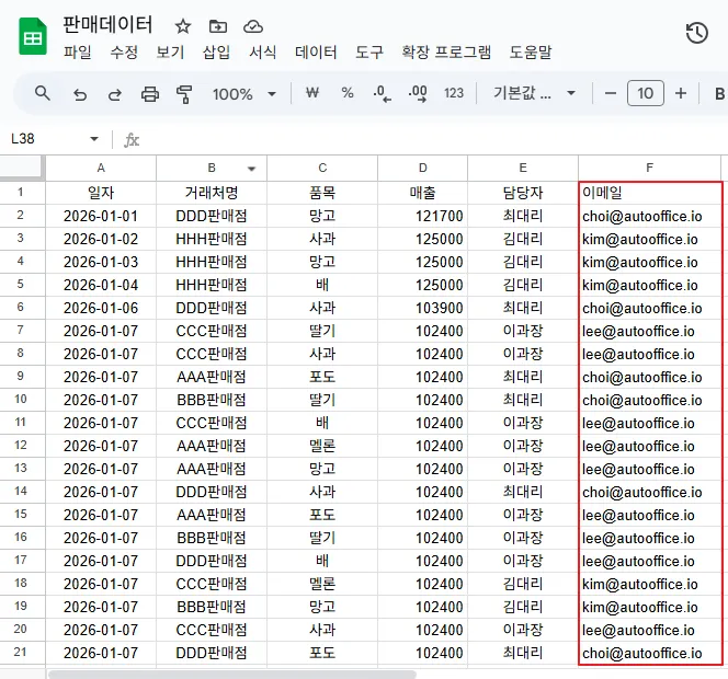 예를 들어, 아래는 거래처별 매출 정보를 담고 있는 판매 데이터입니다. 우측에는 각 담당자의 이메일이 기입되어있지요.