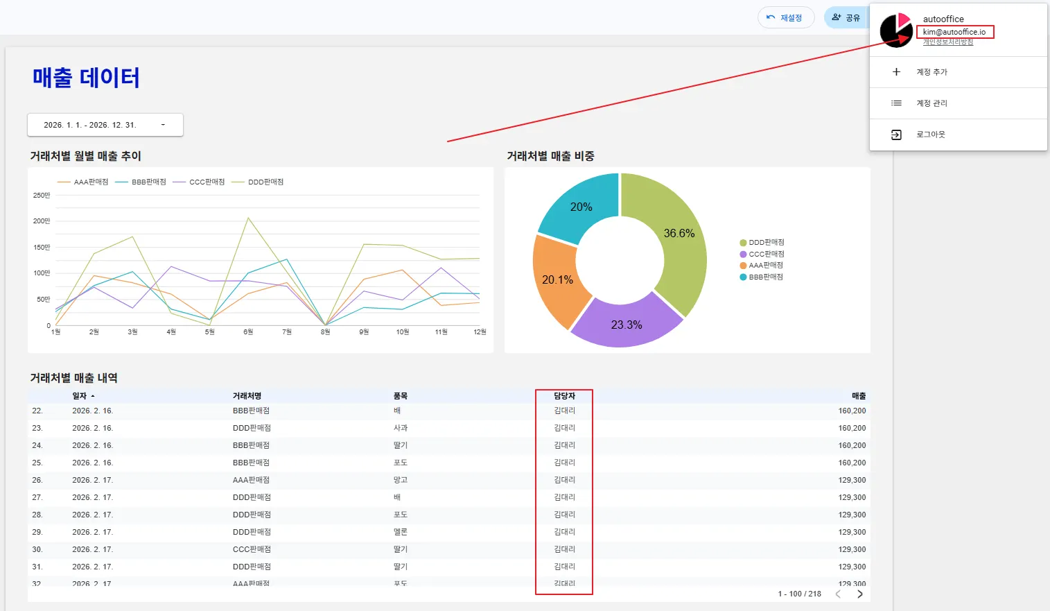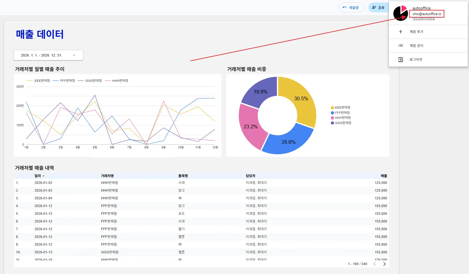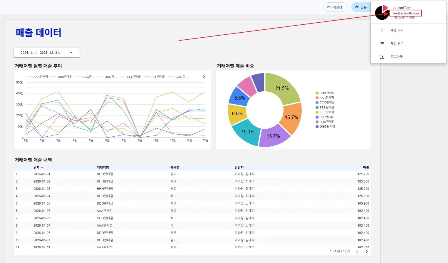 먼저 이과장(lee@autooffice.io) 계정으로 로그인해볼까요? 이과장은 모든 거래처를 담당하고 있습니다. 차트에 전체 거래처의 정보가 잘 반영되고 있지요?