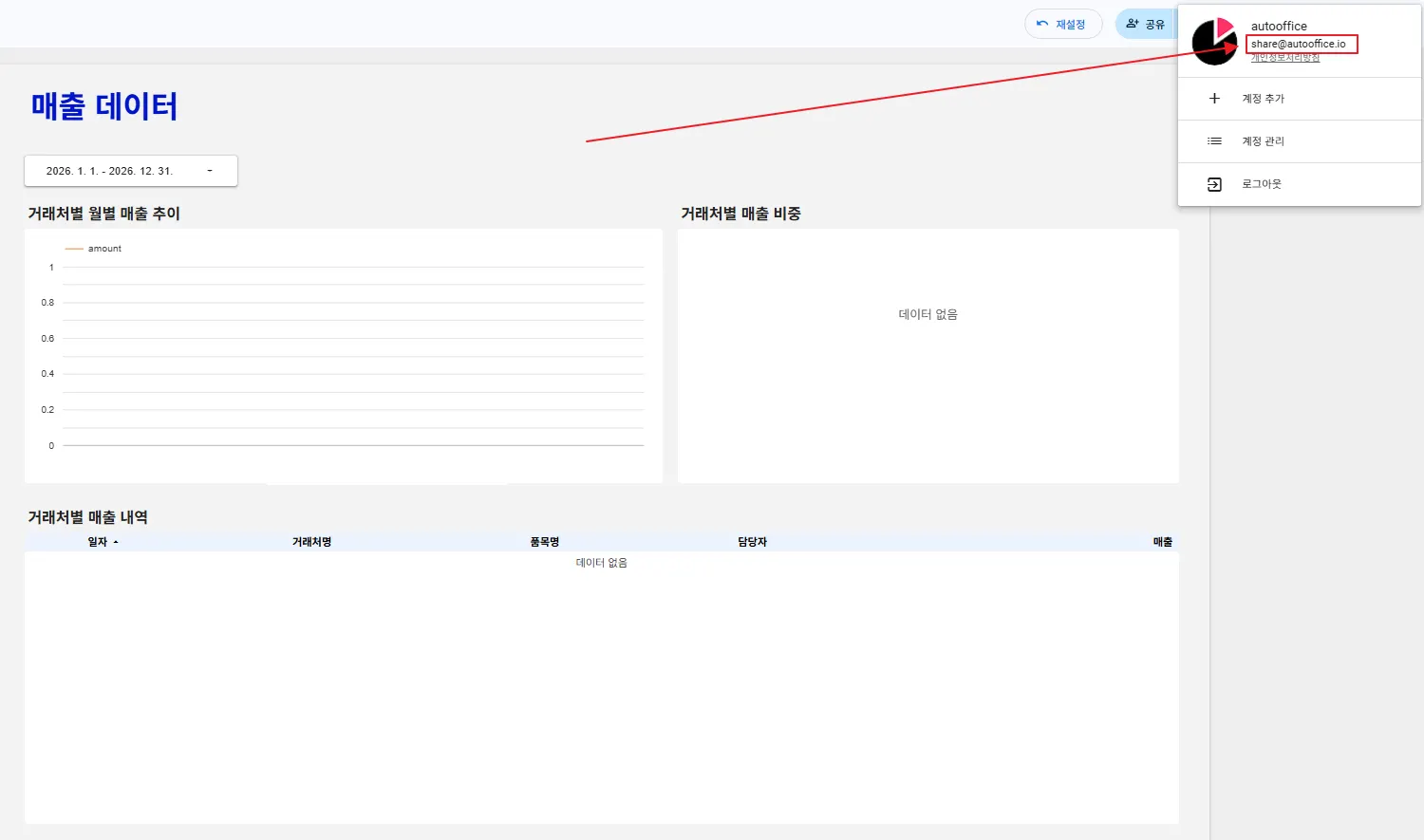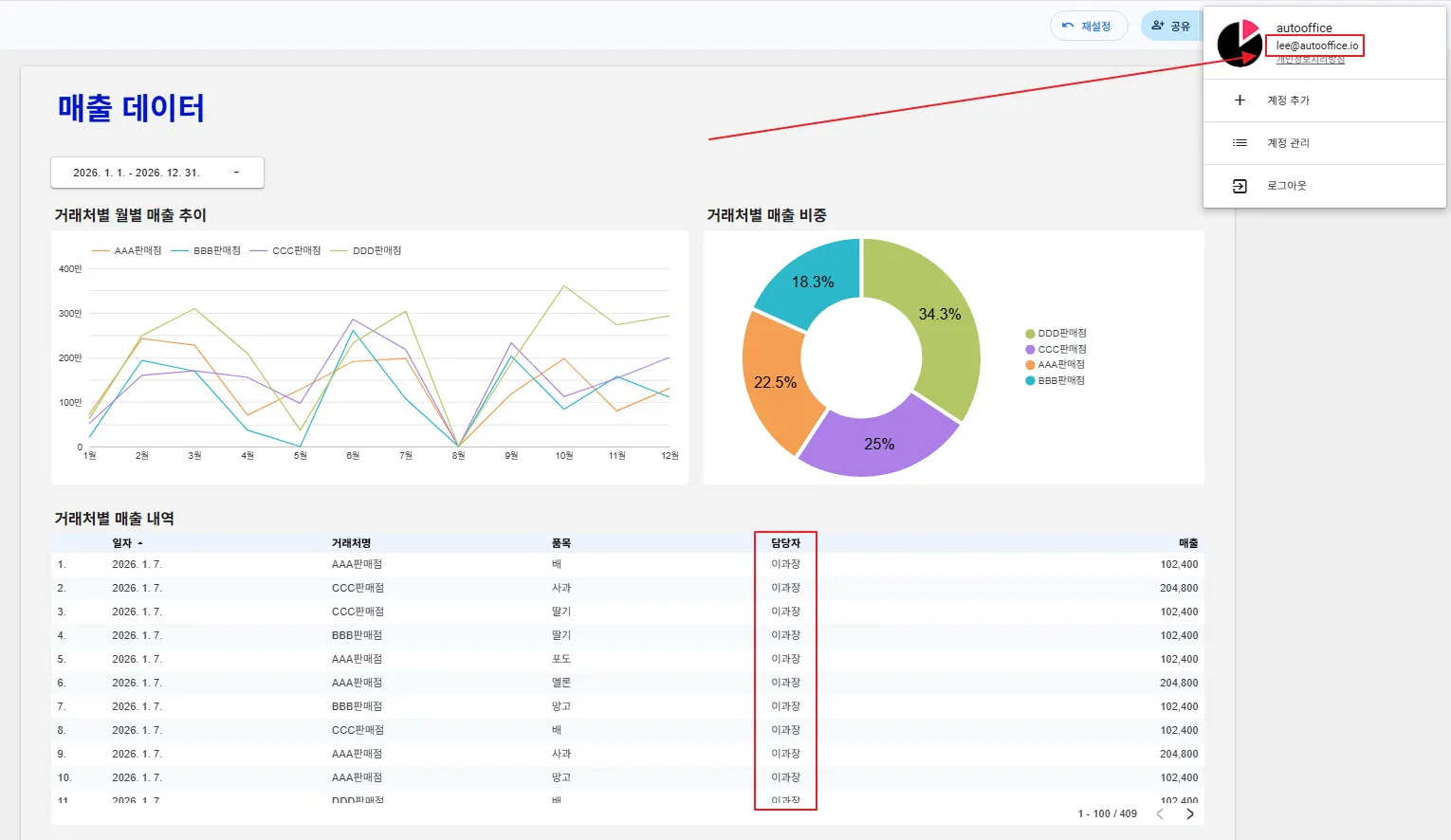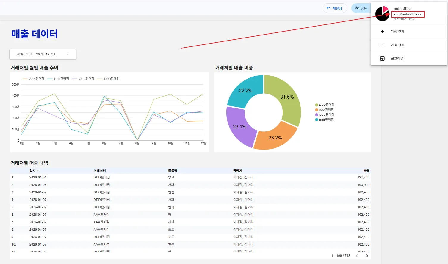 먼저 이과장(lee@autooffice.io) 계정으로 로그인해볼까요? 이과장은 모든 거래처를 담당하고 있습니다. 차트에 전체 거래처의 정보가 잘 반영되고 있지요?