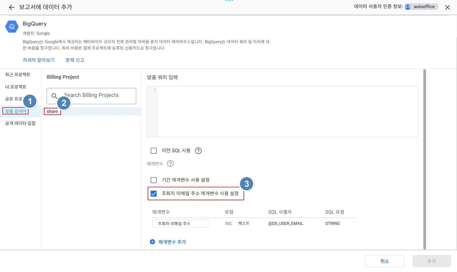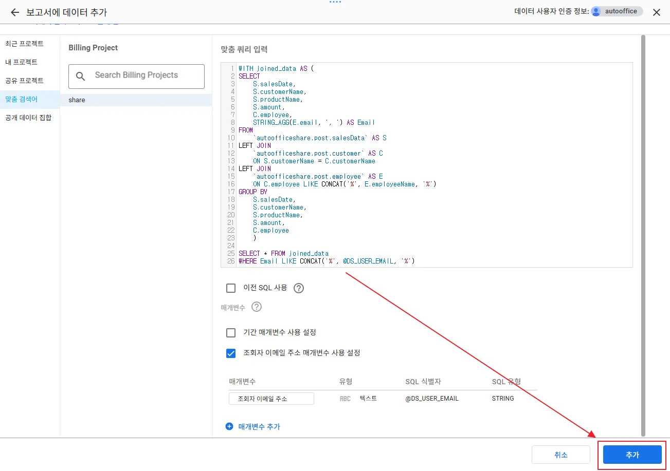 다음 화면에서 ‘맞춤 검색어’ → 데이터세트 선택 → ‘조회자 이메일 주소 매개변수 사용 설정’을 체크합니다.