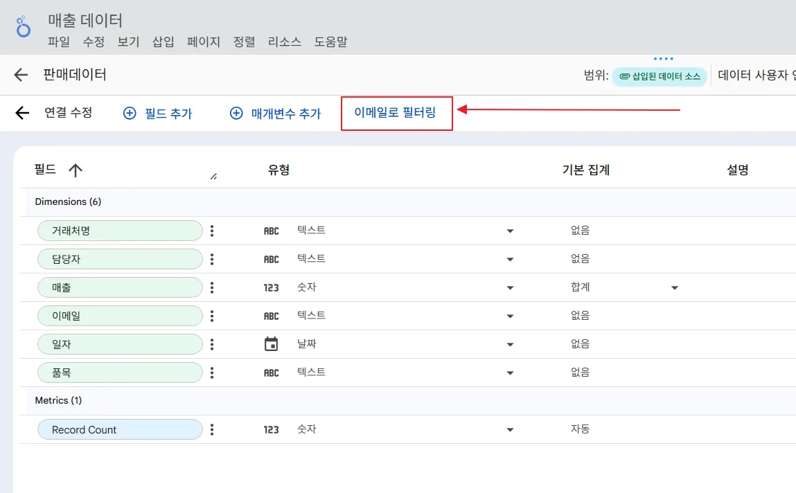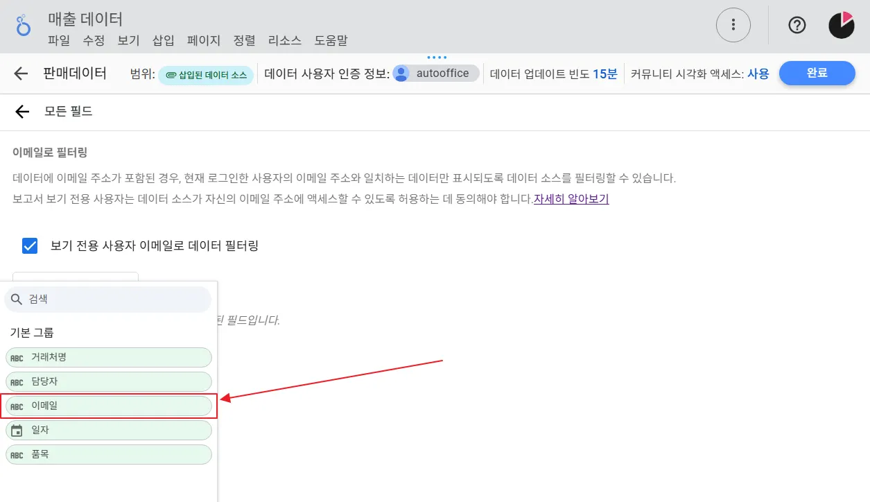 그러면 현재 데이터 소스에서 사용중인 필드 목록이 나오는데, 여기서 이메일 정보가 담긴 ‘이메일’ 필드를 선택합니다.
