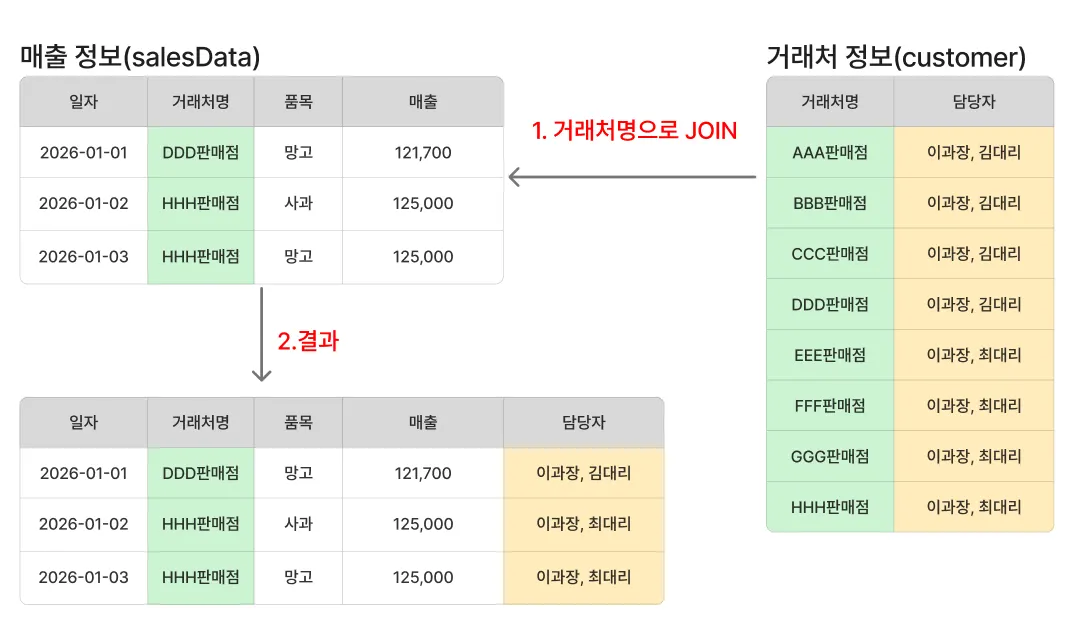 본 예제는 직관적인 이해를 돕기 위해 ‘거래처명’ 직원명’으로 조인(JOIN) 했습니다. 하지만 실무에서는 동명이인이나 데이터 변경 문제를 방지하기 위해 반드시 고유한 키(Key)값을 기준으로 조인해야 합니다.