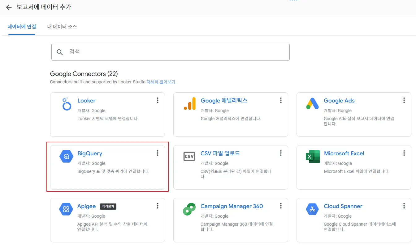 다음 화면에 나오듯이 루커 스튜디오는 구글 애널리틱스, MSSQL, MySQL, postgreSQL 등 다양한 데이터와의 연결을 지원합니다. 이번 예시에서는 빅쿼리를 사용할 것이므로 빅쿼리(BigQuery)를 선택하겠습니다.