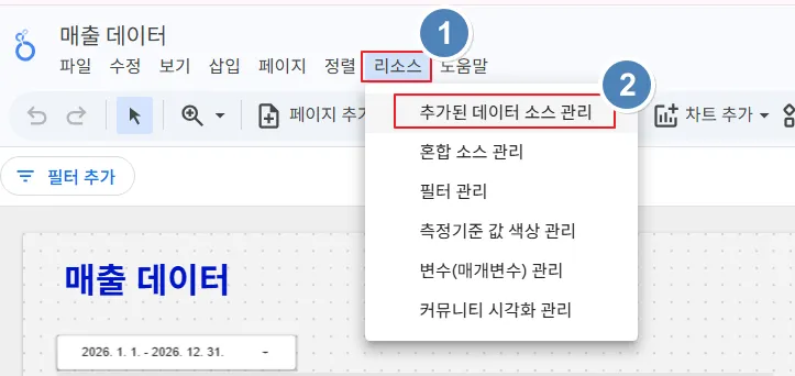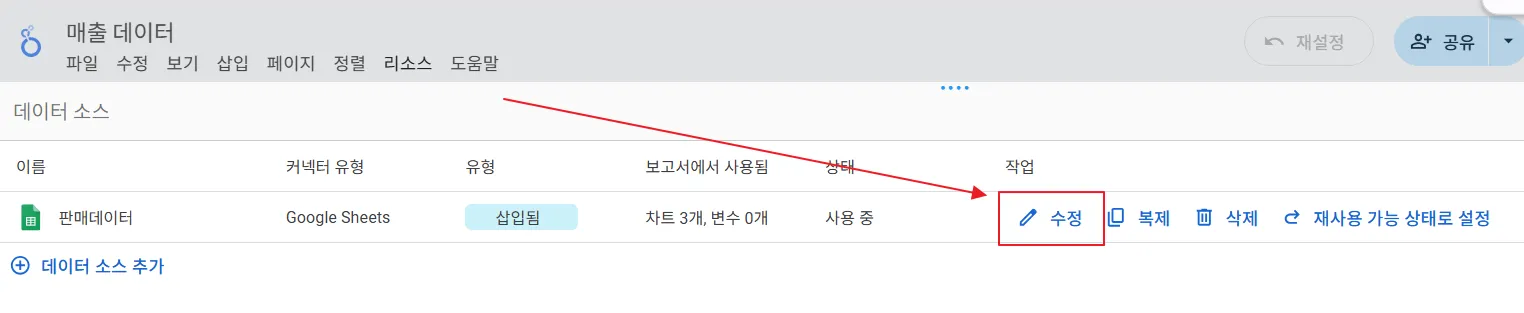 수정 화면에서 상단 메뉴의 ‘리소스’ → ‘추가된 데이터 소스 관리’를 클릭합니다.