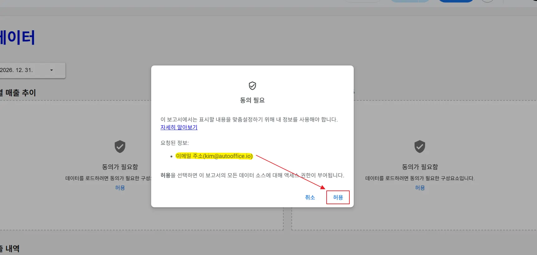 여기서 ‘허용’ 버튼을 클릭하여 대시보드에 접속한 내 이메일 주소를 수집하는 것에 대한 동의를 해주어야 합니다.