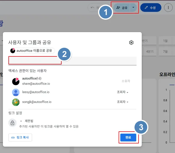 ‘공유’ → 이메일 주소 입력 → ‘완료’ 클릭