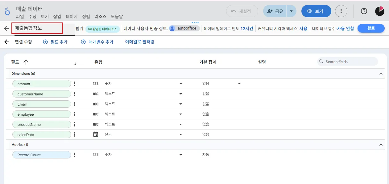 이렇게 추가한 데이터 소스는 아래와 같이 ‘매출통합정보’로 수정하였습니다.