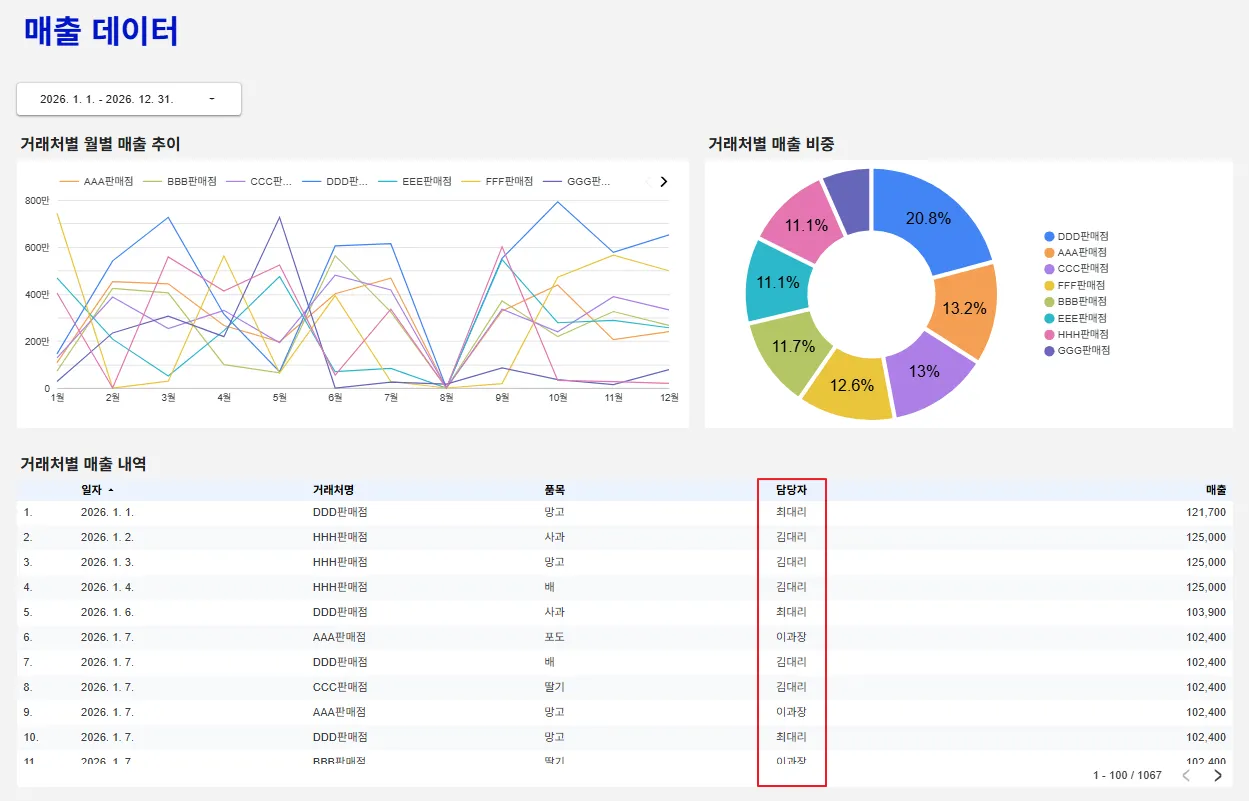 각 계정별로 로그인할 때 차트 데이터가 어떻게 바뀌는지 테스트해볼까요? 각 담당자별 담당 거래처를 기억해주세요.
