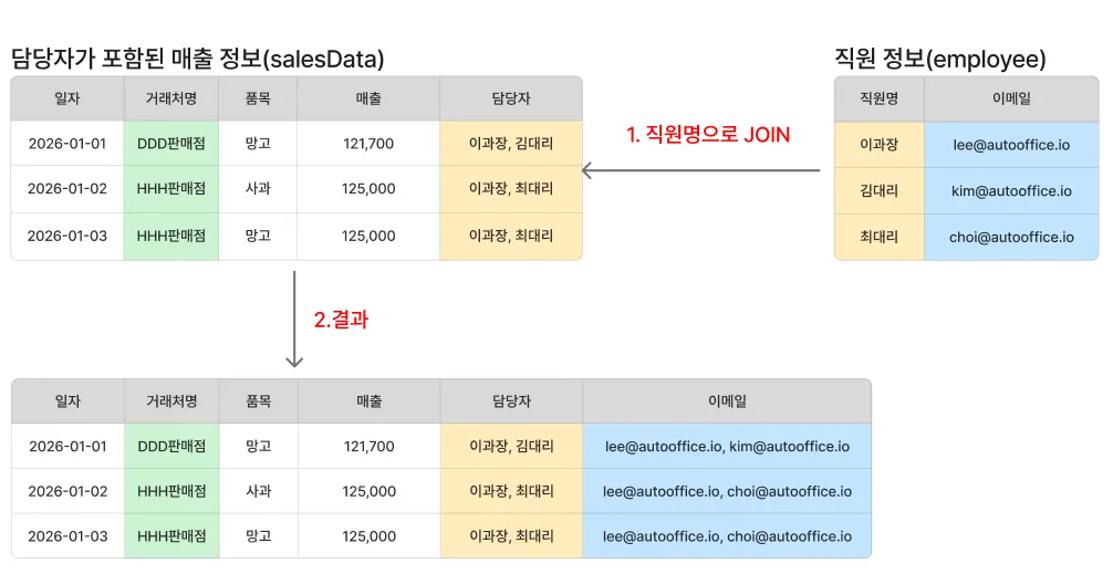 그 다음으로 담당자가 포함된 매출 정보에 있는 담당자명과 직원 정보에 있는 직원명을 조인(JOIN)하여 담당자 이메일을 덧붙입니다. 각 이메일은 콤마(,)로 구분하였습니다.