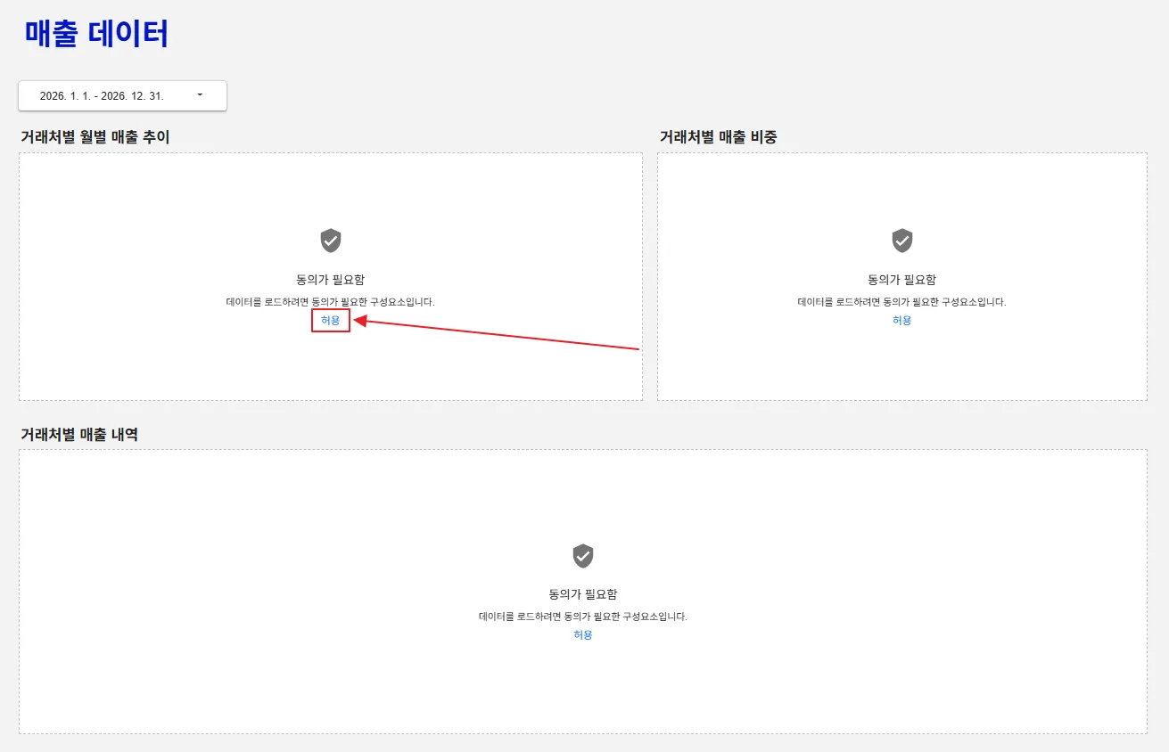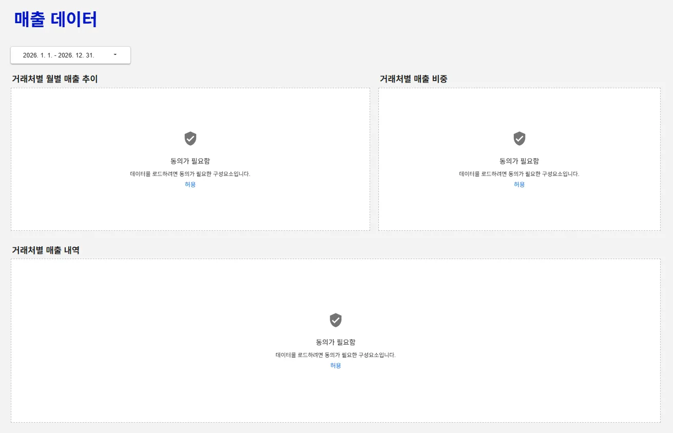 그리고 대시보드를 다시 보면 이메일로 필터링하는 데이터 소스의 차트에 ‘동의가 필요함’ 문구와 함께 ‘데이터를 로드하려면 동의가 필요한 구성요소입니다.’ 라는 문구가 노출됩니다. 현재 로그인한 사용자의 이메일 주소 정보와 데이터 소스 내의 ‘이메일’컬럼과 대조하기 위해서는 사용자의 이메일 정보를 활용해야하는데 이것에 대한 동의가 없었기 때문입니다.