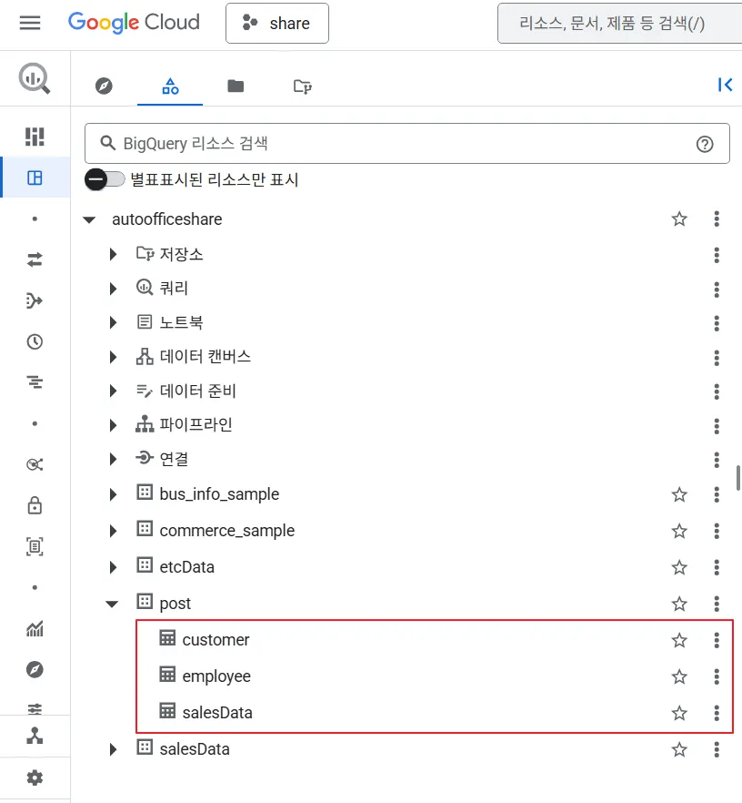 각각의 시트는 빅쿼리 테이블과 연동하여 아래와 같이 세팅해두었습니다.