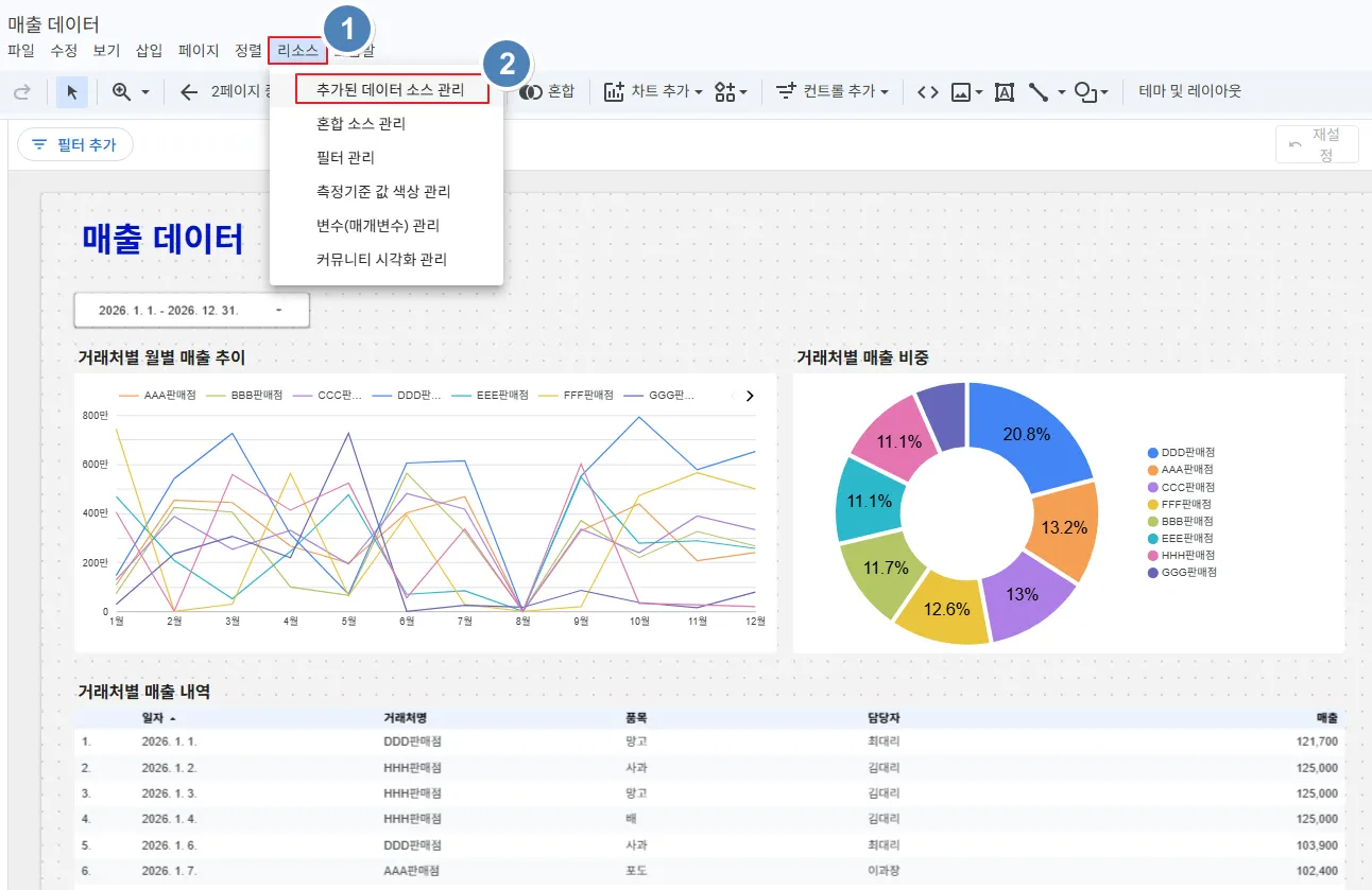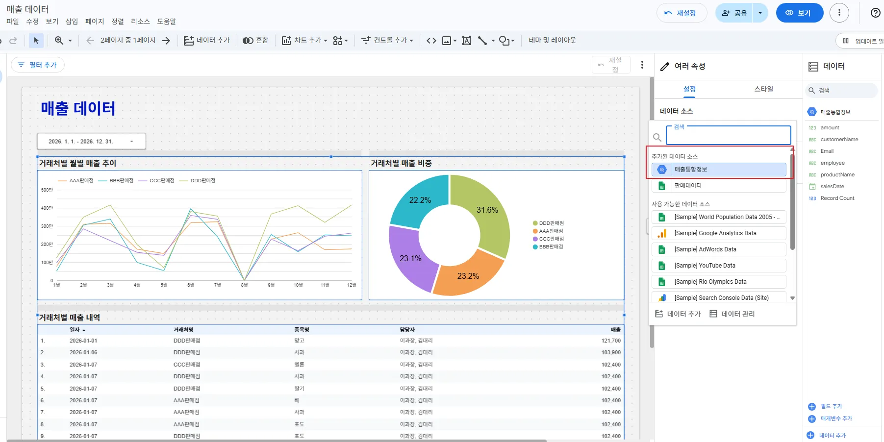 기존 차트의 데이터 소스를 새롭게 추가한 ‘매출통합정보’로 변경하였습니다.