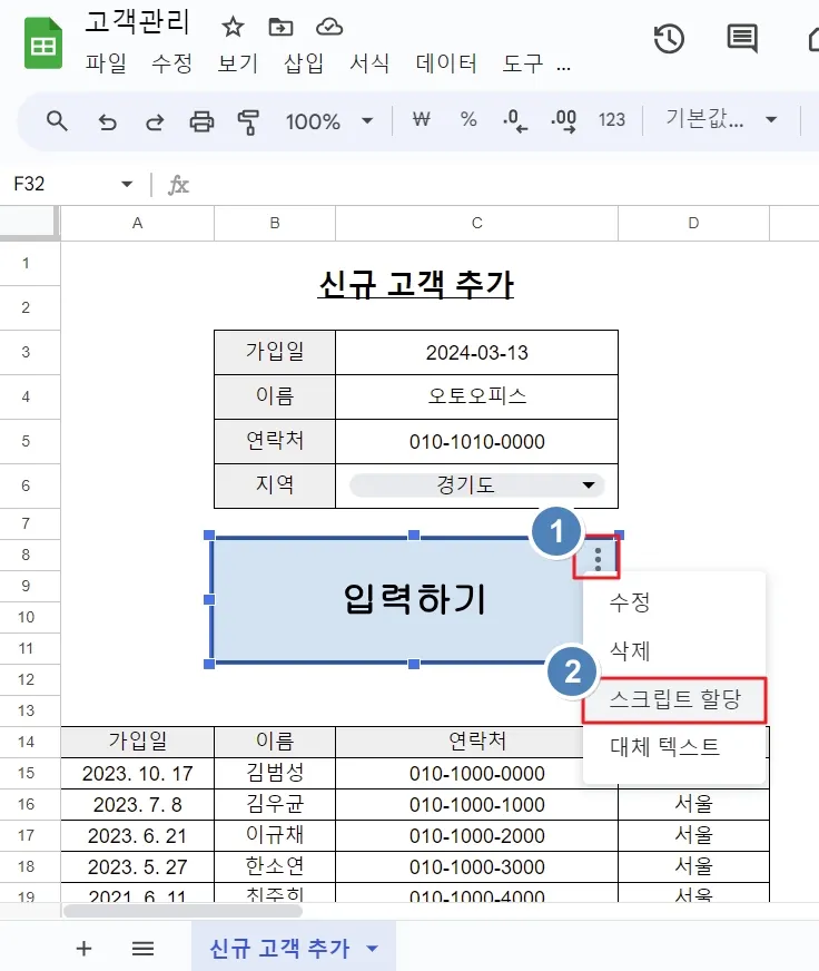 다음의 스프레드시트는 신규 고객의 정보를 입력하는 시트와 데이터가 저장되는 시트가 동일합니다. 신규 고객의 가입일과 이름, 연락처와 지역을 설정한 뒤에 ‘입력하기’ 버튼을 누르면, 하단에 데이터가 기입이 된다고 예를 들어보겠습니다.