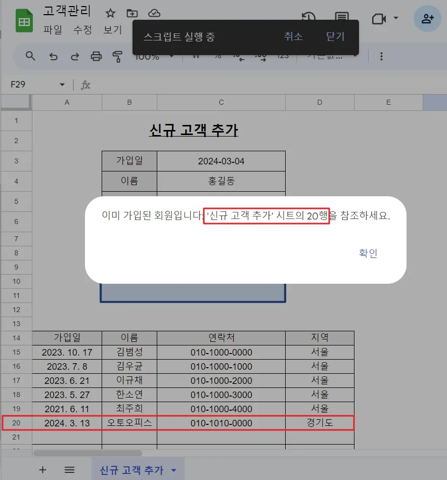 이제 검색 조건인 연락처를 제외한 가입일, 이름, 지역을 바꾼 채로 다시 ‘입력하기’ 버튼을 클릭해보겠습니다. 연락처가 중복이 된다면 데이터의 삽입이 이루어져서는 안되며, 중복된 셀의 위치를 알림창을 통해 전달받아야 합니다. 테스트를 위해 다음의 정보를 입력하였습니다.