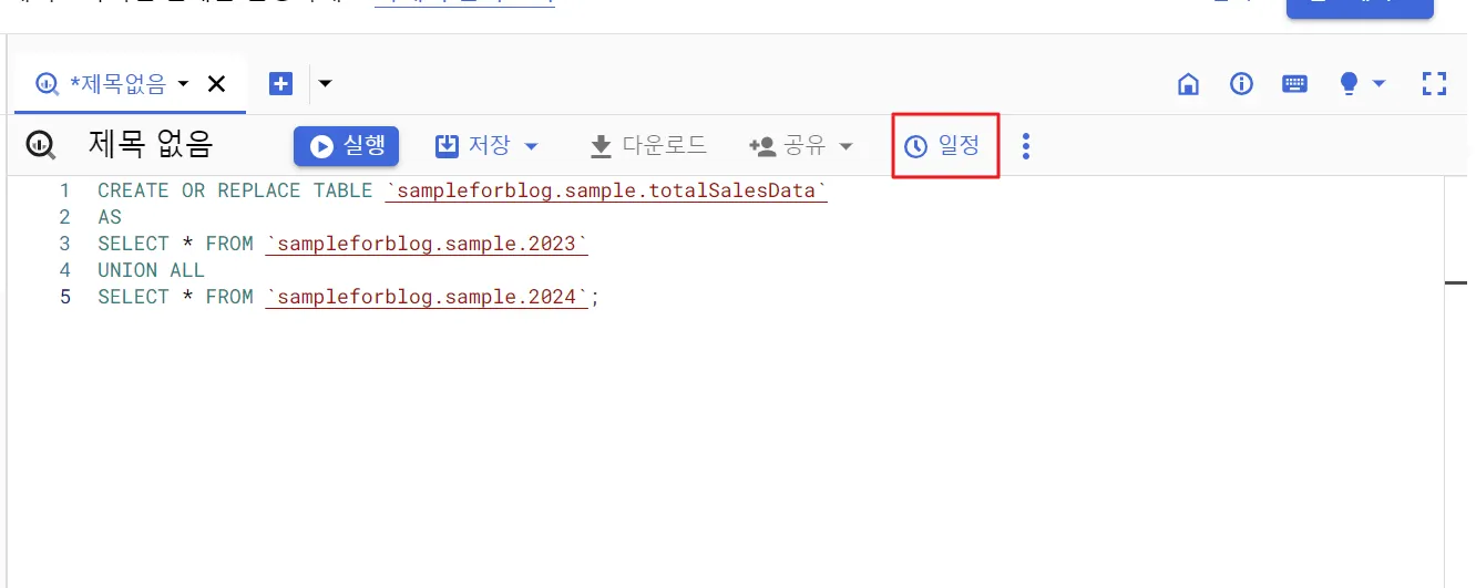 쿼리가 모두 작성되었다면 상단에 보이는 ‘일정’ 버튼을 클릭합니다.