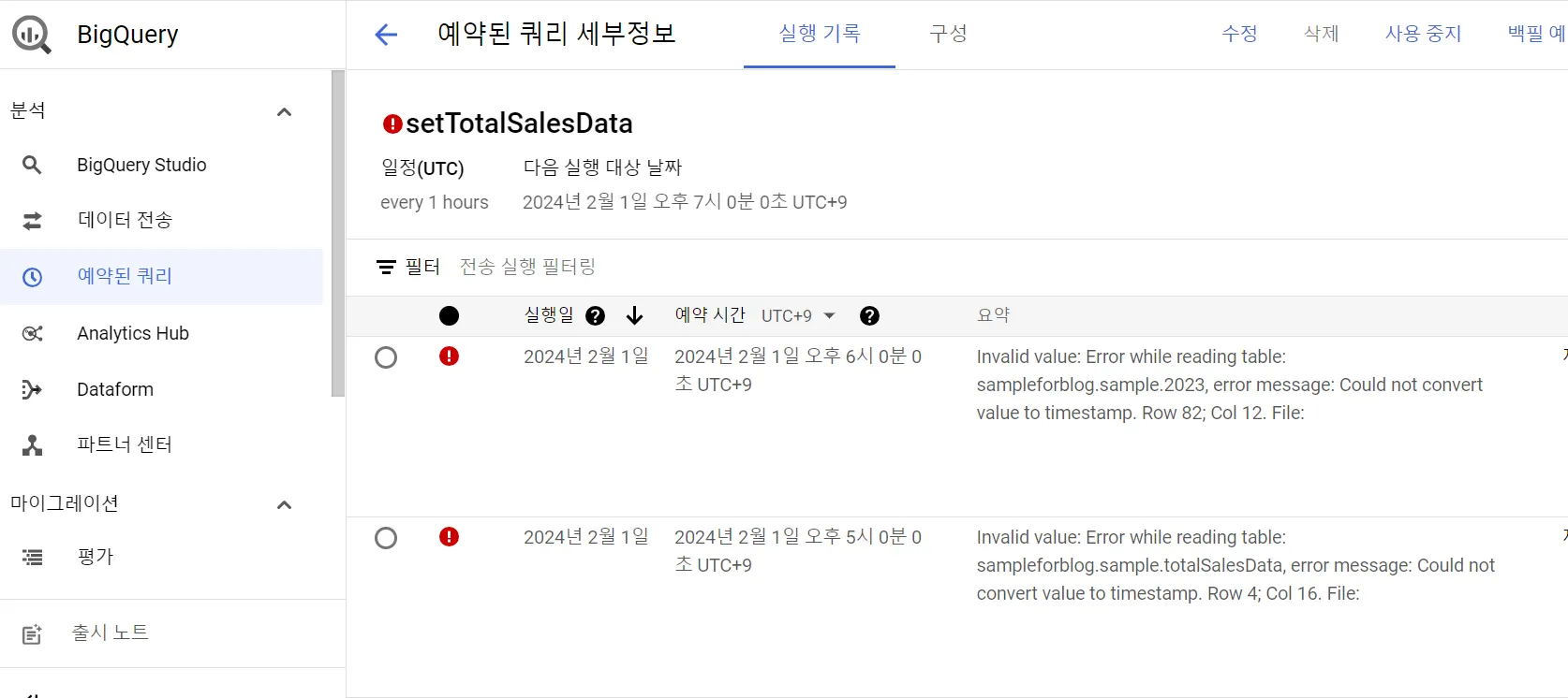 눈치 채셨겠지만 초록색 체크 표시는 쿼리가 정상적으로 실행되었다는 표시입니다. 빨간색 느낌표는 쿼리가 정상적으로 실행되지 않고 문제가 발생했다는 뜻이겠지요. 빨간색 느낌표 표시가 있는 예약 쿼리를 클릭해볼까요?