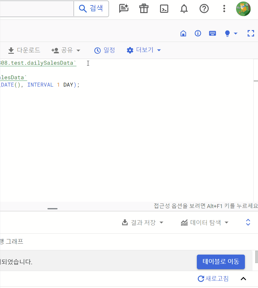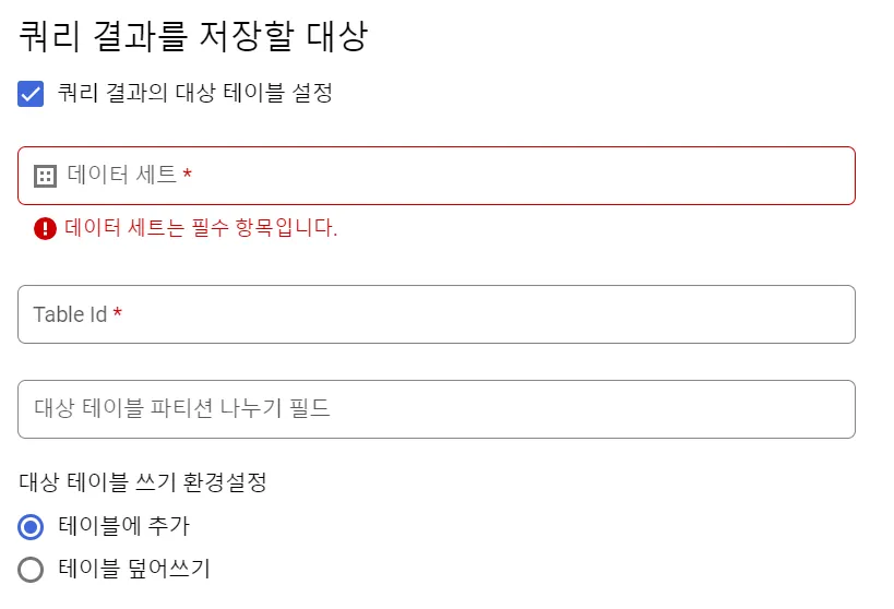 쿼리 결과 저장: 예약된 쿼리의 실행 결과는 필요한 경우 빅쿼리 테이블에 저장할 수 있습니다. 이를 통해 결과를 나중에 분석하거나 시각화할 수 있습니다. 쿼리 자체에 CREATE 문이 들어있다면 결과는 자동으로 테이블을 생성하고 데이터를 넣어주지만, SELECT문만 있다면 결과를 저장할 대상을 선택해주어야 합니다.