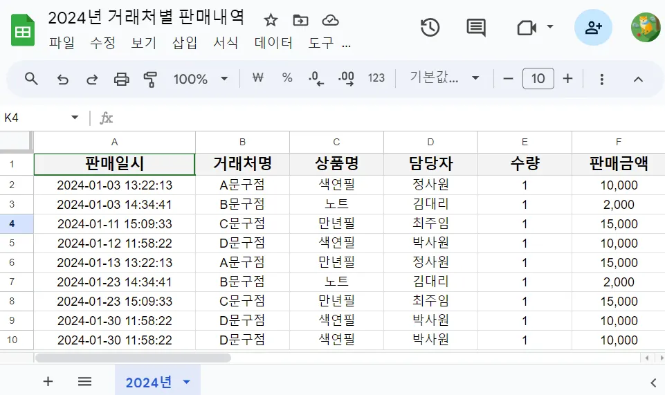 그리고 아래의 시트는 2024년 물건 판매 내역을 담고 있습니다.