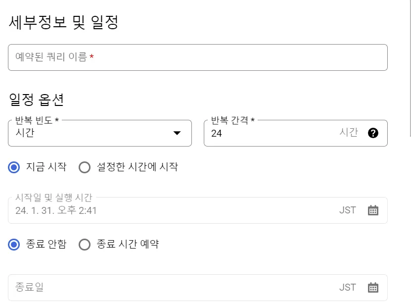 이제 쿼리를 예약하는 화면이 표시됩니다.