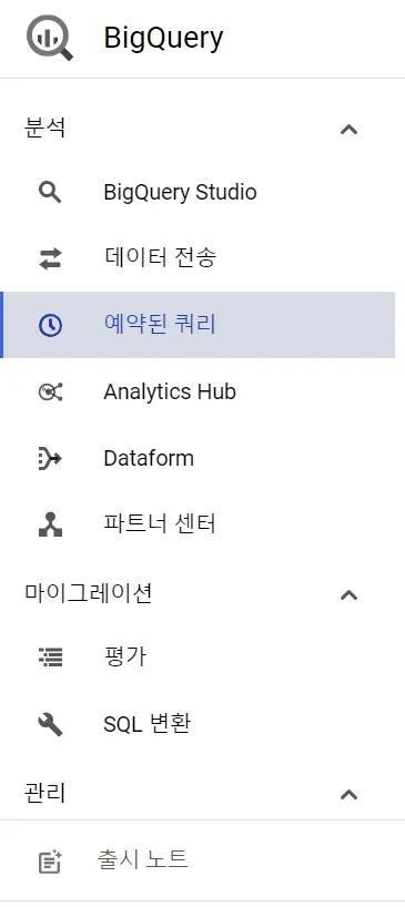 쿼리 예약이 저장되었다면 예약이 잘 되었는지, 예약해두었던 쿼리가 잘 실행되었는지 확인해보아야겠죠? 좌측 메뉴에서 ‘예약된 쿼리’ 메뉴를 클릭합니다. 이 메뉴에서 현재 예약되어있는 모든 예약 쿼리를 확인할 수 있습니다.