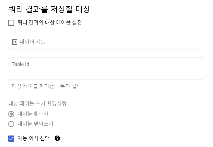 쿼리 결과를 저장할 대상: 이 옵션에 체크를 하면 select 결과물을 자동으로 테이블에 저장합니다.
